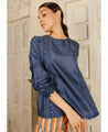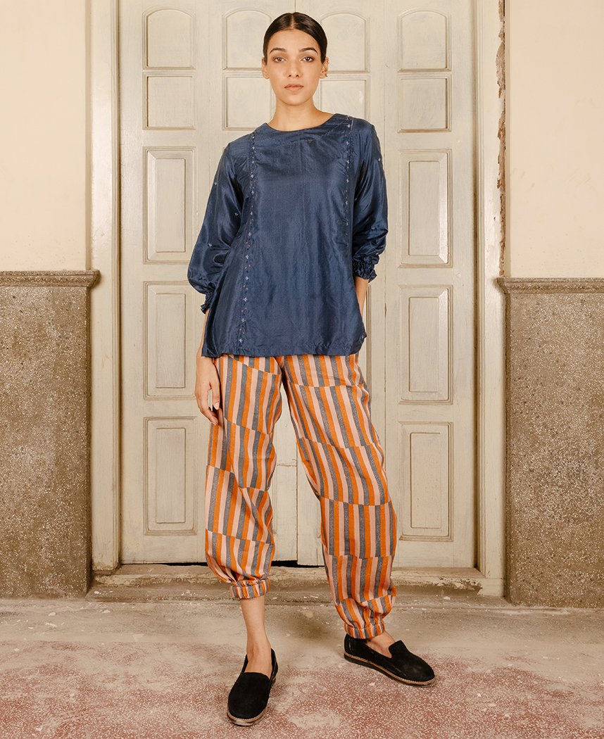 A relaxed A-line top with hand embroidered flowers on the sleeves and front seams. Features elasticated cuffs and a concealed back zipper. Length 26". The model is wearing a size S. Made in 100% mulberry silk.