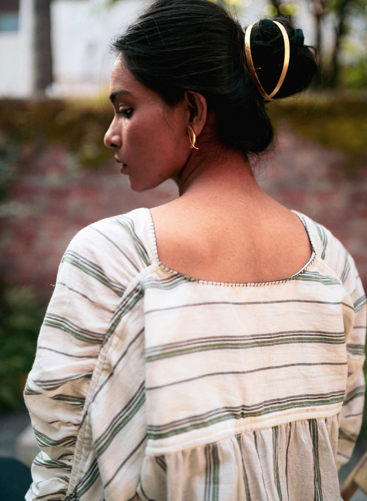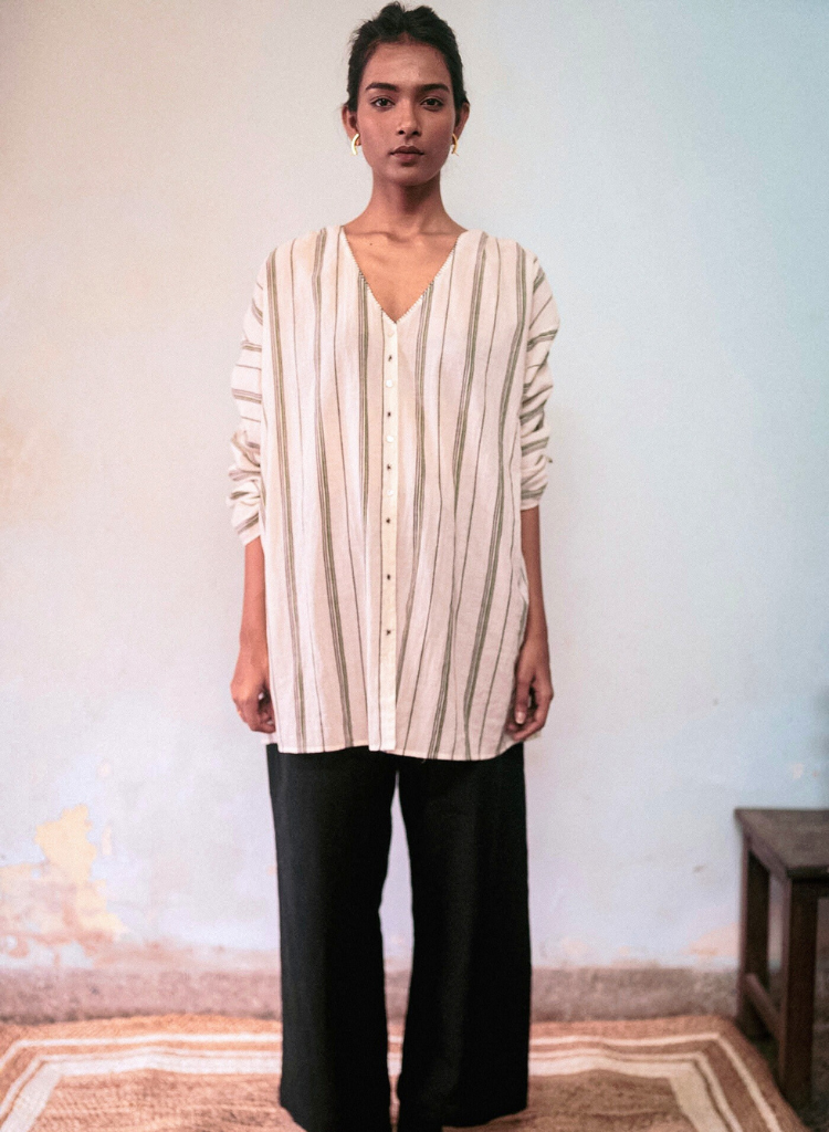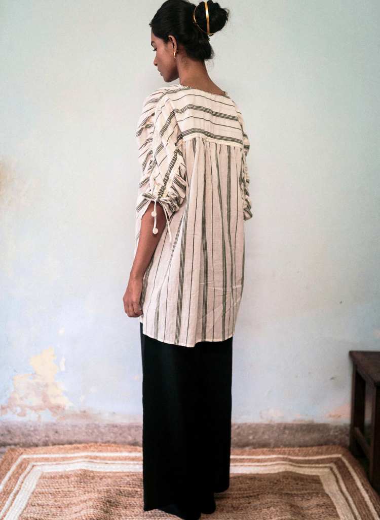 A striped tunic enhanced with hand embroidered details on the neck and placket with contrast black colour for added character. Features long, soft gatheres on sleeves. The model is 5'9" and is wearing a size M.