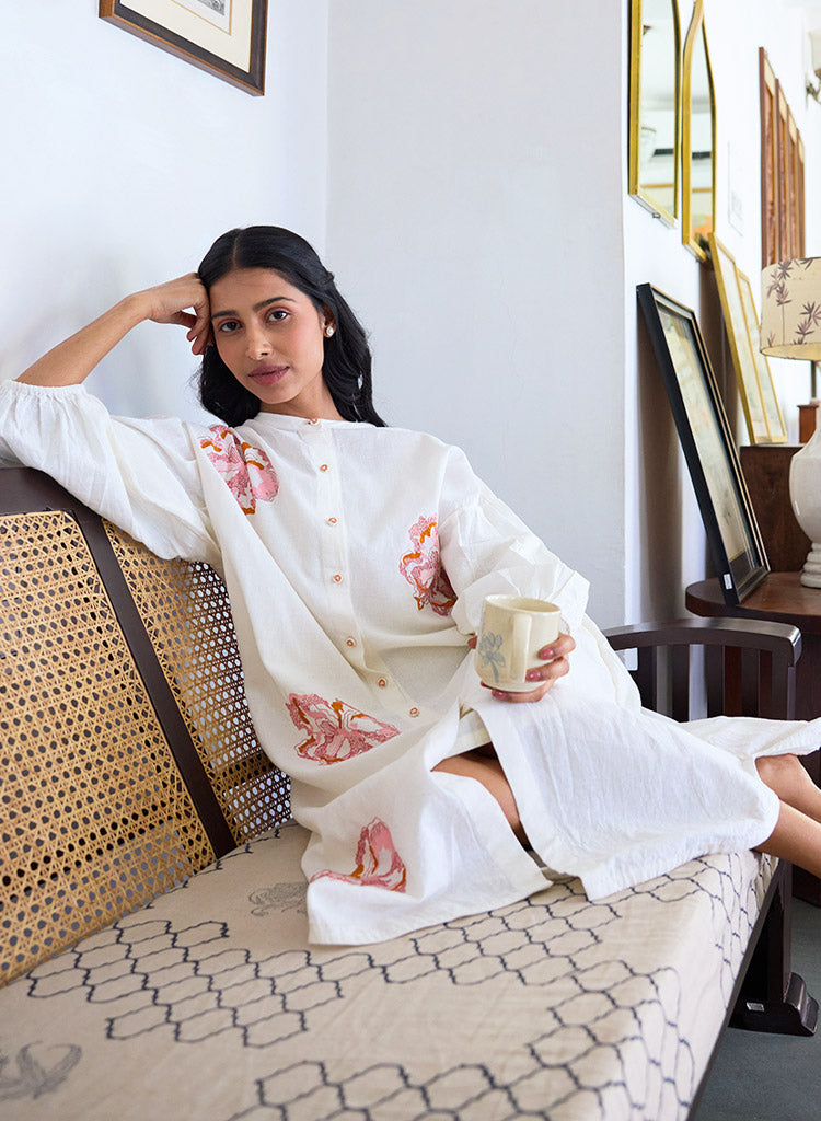 A two-piece set pairing the Kent Dress and the Carly Pants. The midi tunic dress with floral hand embroidery and pleated sleeves features a mandarin collar, drop shoulders and a front button placket. Length 44". The straight-fit pants feature an embroidered scalloped hem and inseam pockets. Length 38". The model is 5'6" and is wearing a size S.