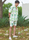 A two piece set pairing the Khajoor Resort Shirt and a matching shorts. The hand block printed shirt features a clamp collar and a front button placket with wooden buttons. Length 28.5”. The matching shorts feature an elasticated waist and inseam pockets. Length 16.5". The model is 6ft and is wearing a size S. Made in cotton, dyed using chemical free dyes. This piece is hand block printed and handcrafted in small batches. Variations in colour, texture, print and finish are inherent to the process, making each piece unique.