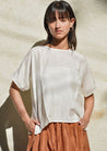 A box style top featuring a round neck, kimono sleeves and side slits. Length 21". The model is 56' and is wearing a size S.