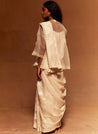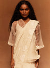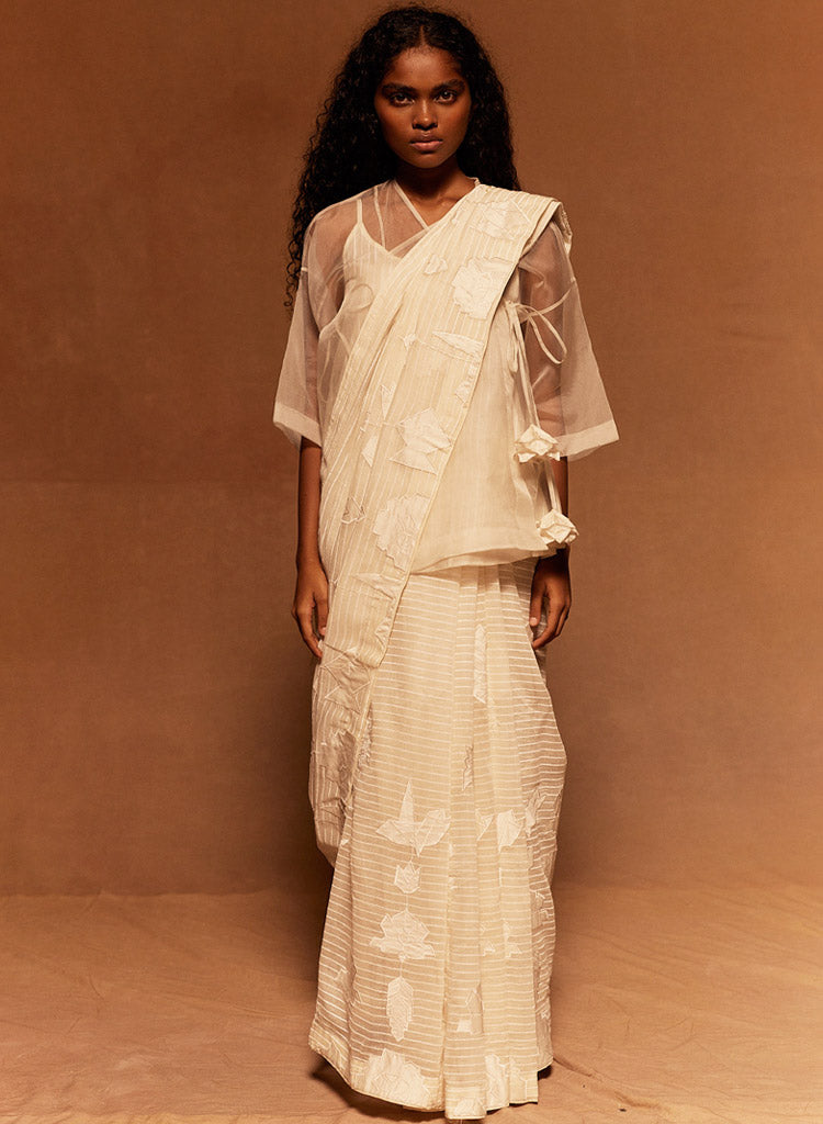 A hand-screen printed saree with delicate appliqué and handcrafted tassels, creating a visually captivating piece. Its soft, luxurious fabric offers a refined drape, while the timeless design ensures it remains a cherished addition to any wardrobe. Length 5.75 mtr.