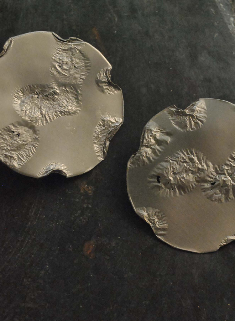 A pair of oxidized brass, irregular circle studs. Dia 5 cm.