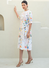 A midi dress with a round neck, a back slit, an adjustable belt. Features 3/4th sleeves and inseam pockets. The model is 5'6 and is wearing size S.