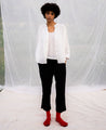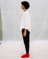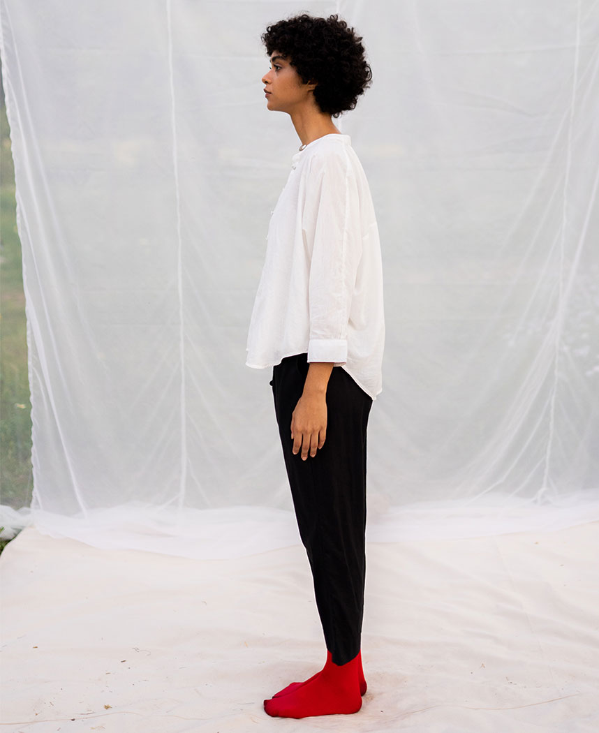 Easy solid pants in a cropped straight fit. Features inseam pockets and an elasticated drawstring waist. Length 36". Made in 100% cotton.