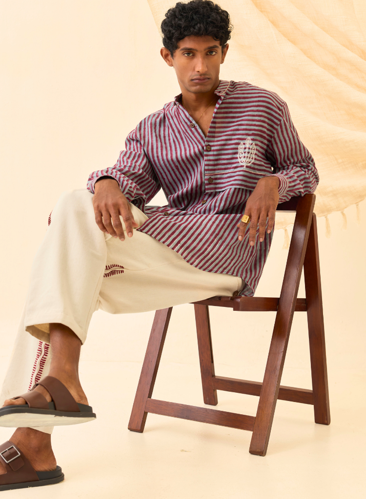 A relaxed fitting shirt accented with hand-embroidery on the left side pane featuring a classic open collar. Length 29". The model is 6'2" and is wearing a size M.