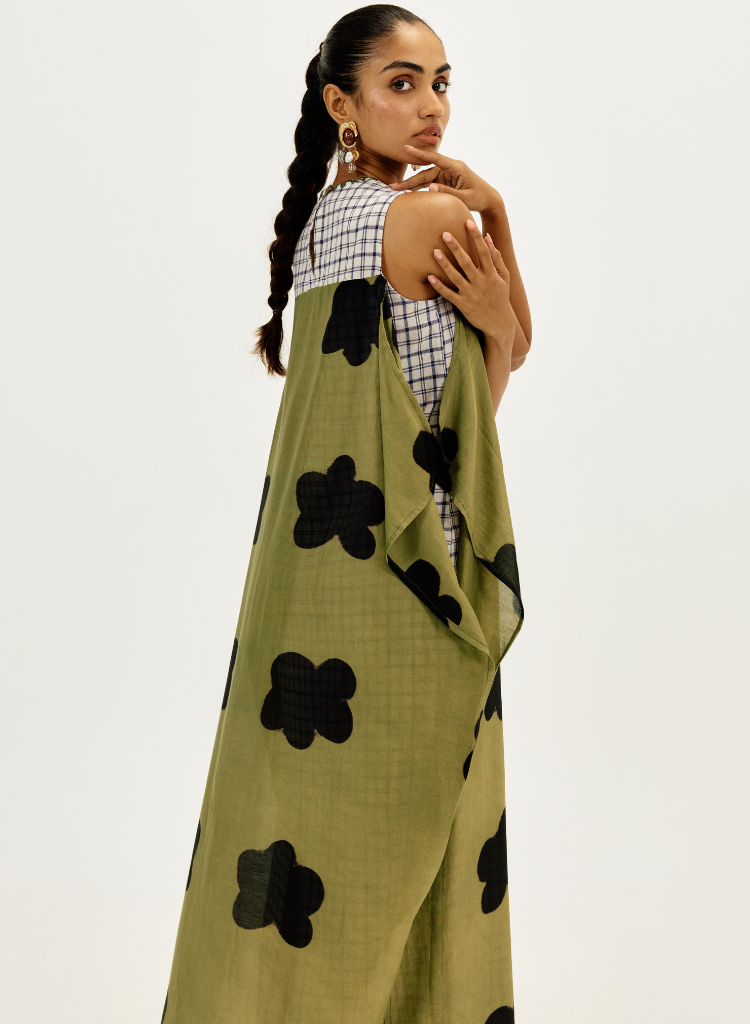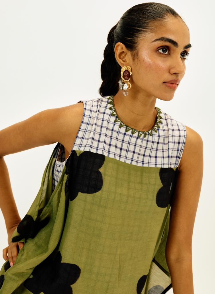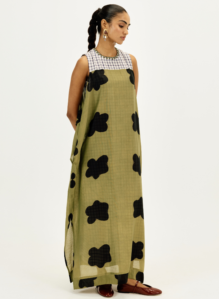 This relaxed-fit maxi dress is crafted in airy clamp-dyed Chanderi fabric with contrast full checkered lining that brings playful structure to the flowy silhouette. Length 51.5". The model is 5'6" and is wearing a size XS.