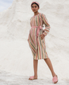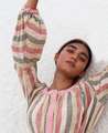 The Kusa Dress is a multistripe dress with a cinched waist and balloon sleeves. 100% naturally dyed in hand woven kala cotton. Model is wearing size S.