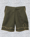 Linen shorts with silk thread embroidery featuring a bottom hem detailed with a blanket stitch on the edge with side pockets. Length 19". The model is 6'1" and is wearing a size S.