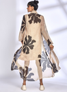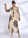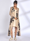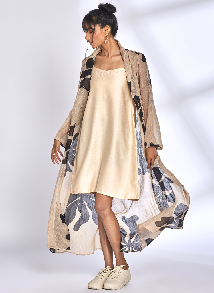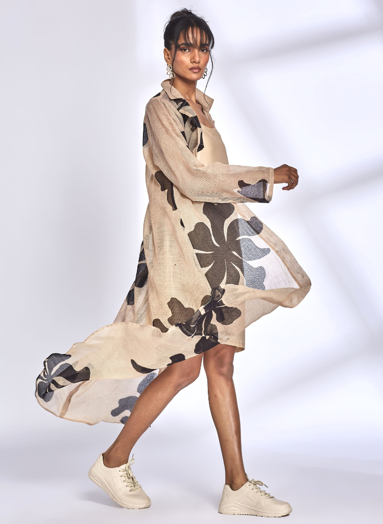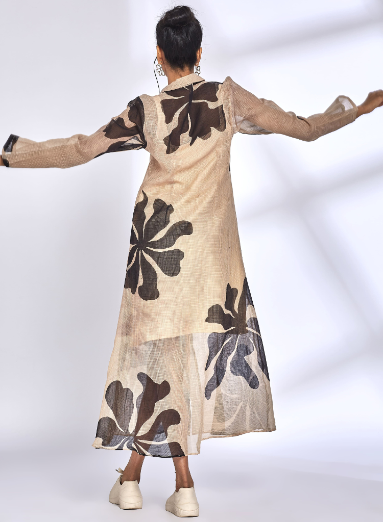An Ajrakh hand block printed floral dress featuring a classic collar and a front button placket. The model is 5'8" and is wearing size S.