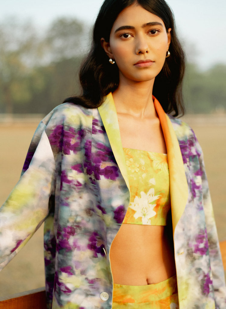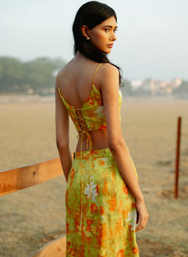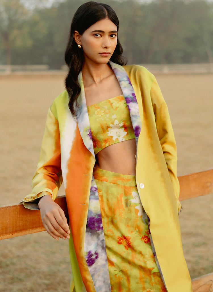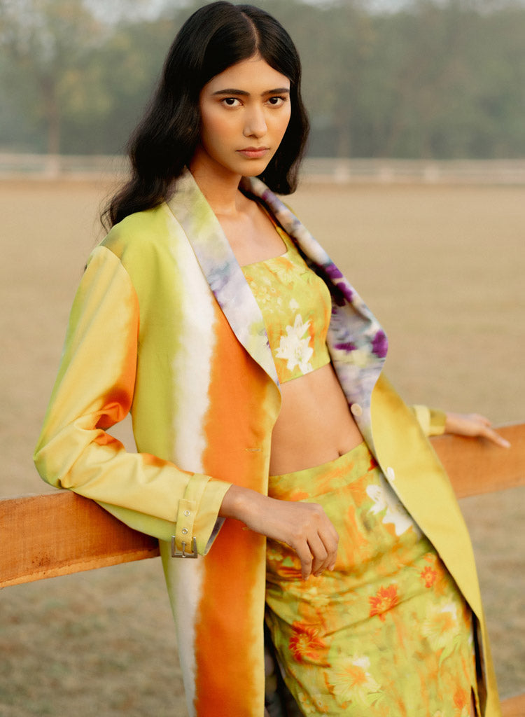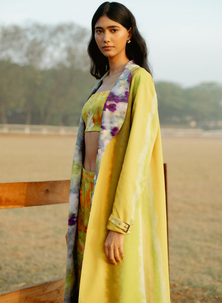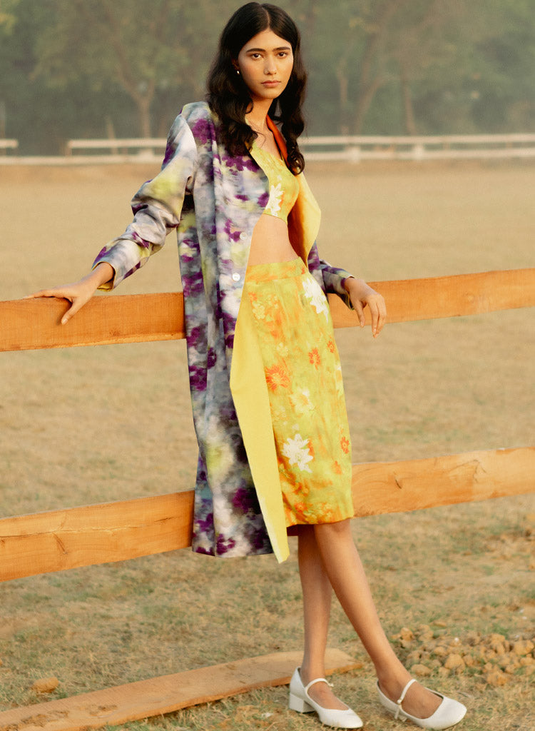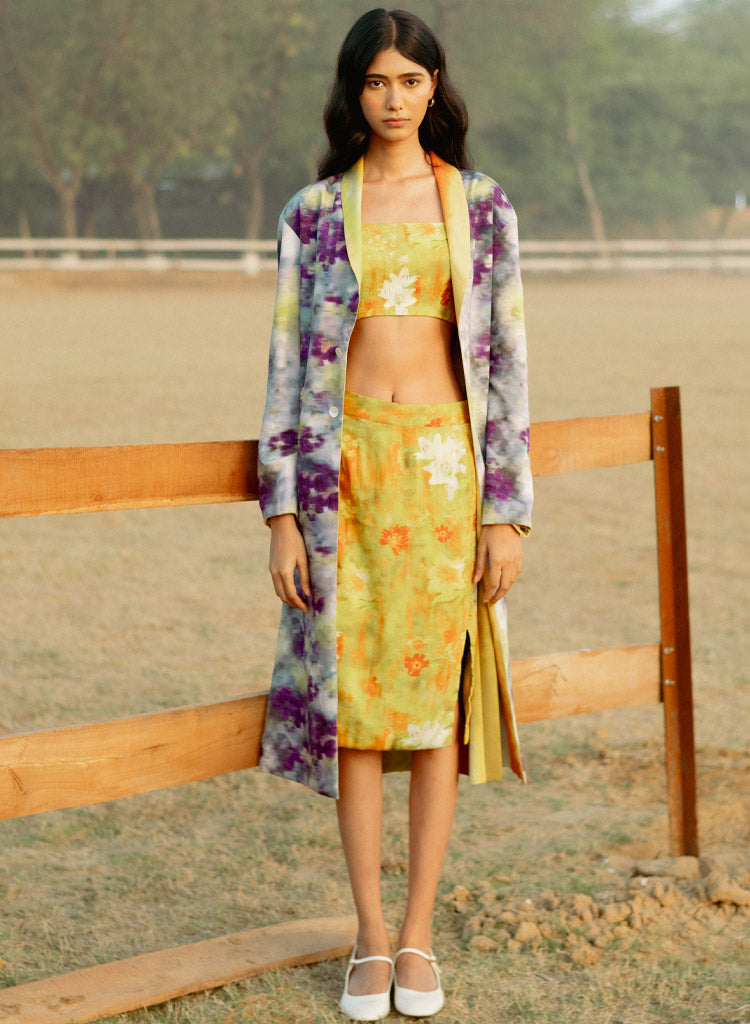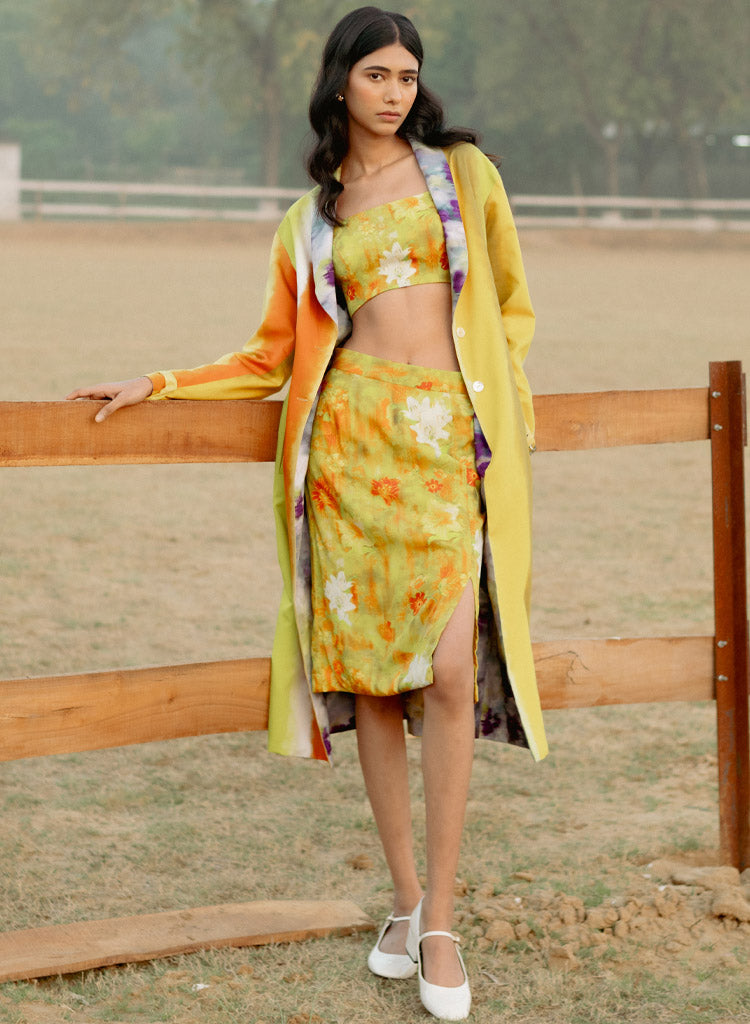 A three-piece set pairing the Edda Reversible Jacket, Elfa Skirt and the Lara Top. The comfort fitting reversible trench coat with captivating buckle details on the sleeves features a lapel collar and inseam pockets. Length 47". The midi A-line skirt with a subtle side slit features a fitted waist and a side zipper opening. Length 25". The tailored fitting crop top features a wide neck, noodle straps and a criss-cross back design that adds a hint of allure. Length 13". The model is 5'11" and is wearing size XS.