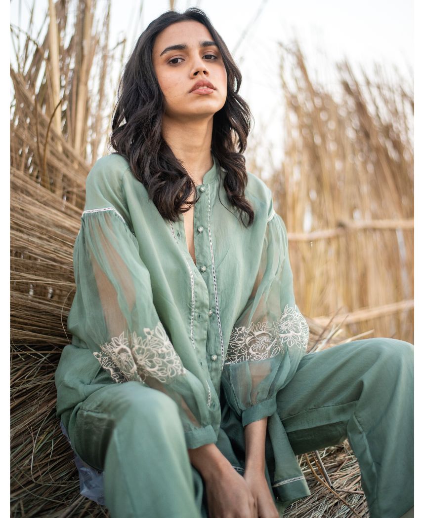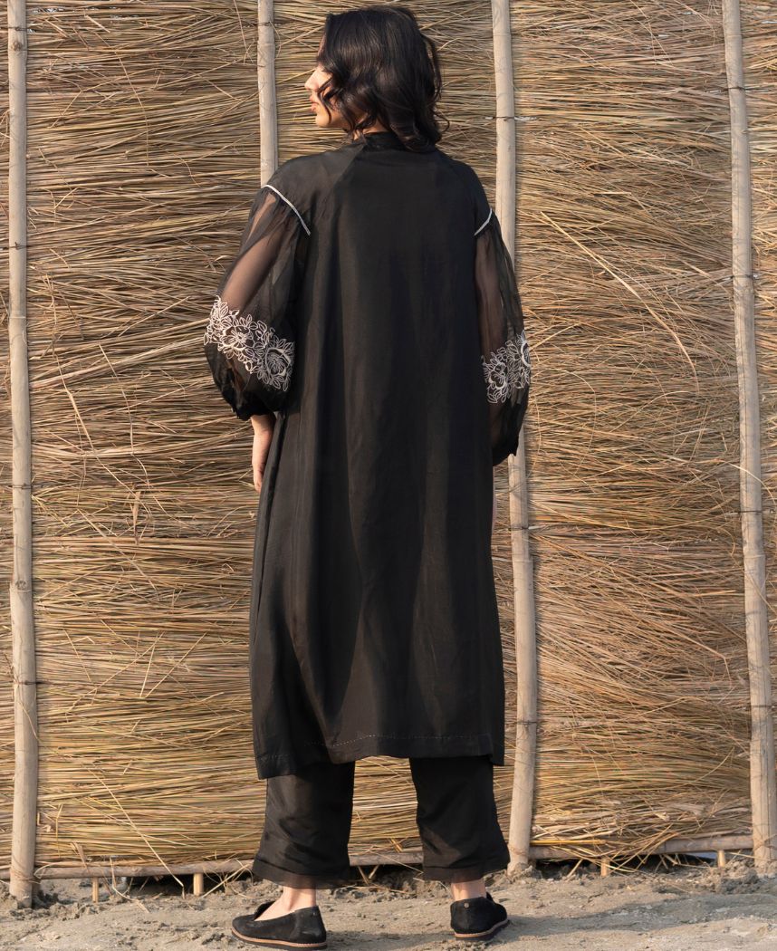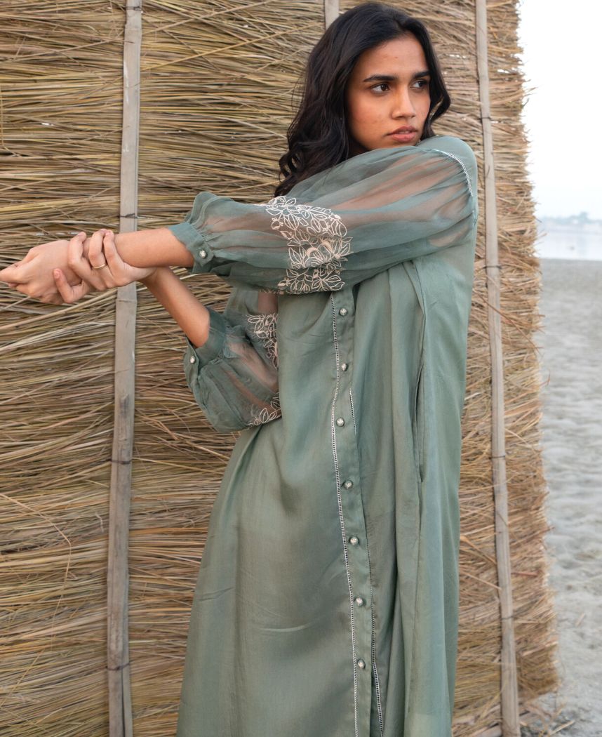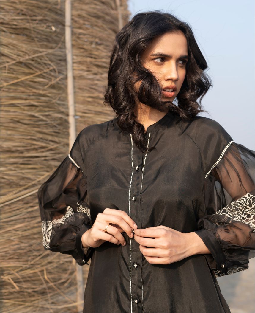 A sheer dress with hand-embroidered 3D flowers on the sleeves. Features a mandarin collar, a front button placket and cuffed sleeves. Length 43". The model is 5'7" and is wearing a size S.