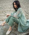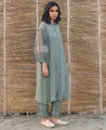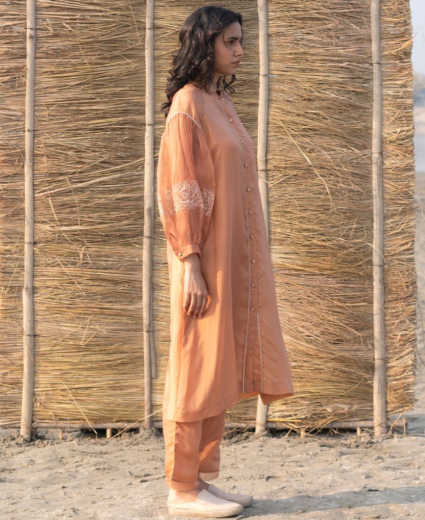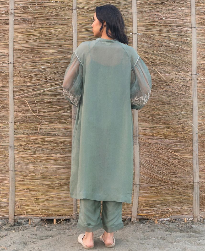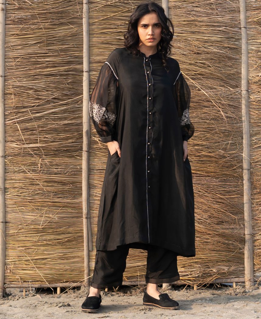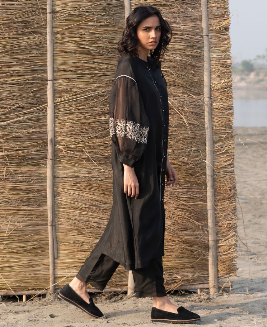 A sheer dress with hand-embroidered 3D flowers on the sleeves. Features a mandarin collar, a front button placket and cuffed sleeves. Length 43". The model is 5'7" and is wearing a size S.
