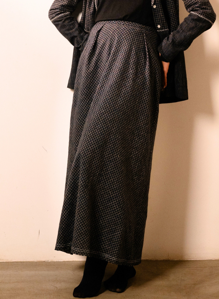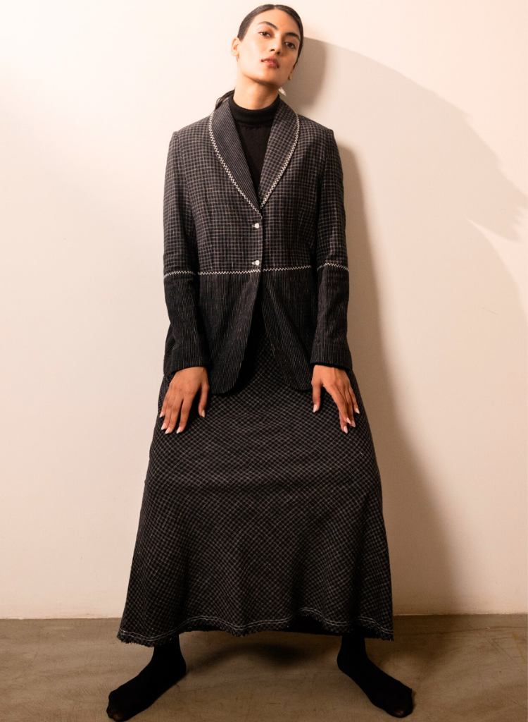 A two-piece set pairing the Lava Checks Blazer and the Lava Checks Skirt. The blazer features a shawl lapel adorned with contrast thread embroidery, mother-of-pearl button closures and hand-embroidered buttonholes adds handcrafted detail. Length 27".The classic A-line skirt features a thin elasticated waist at the back and knife pleats under the waistband flow into a bias-cut flare. Length 38". The model is 5'8" and is wearing a size S.