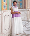 A dual-tone panelled dress featuring a peter pan collar, gathered panels and an eyelet opening in the back. Length 55”. The model is 5'6" and is wearing a size S. Fully lined.
