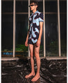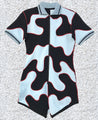 A textured knit playsuit with abstract colour block panels and front zip closure featuring hand knitted collar and cuffs with short sleeve. Length 34". The model is 6'1" and is wearing a size S.