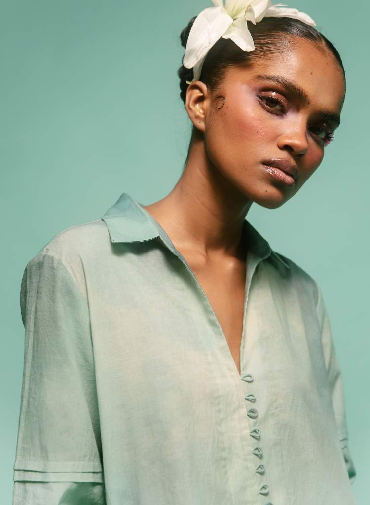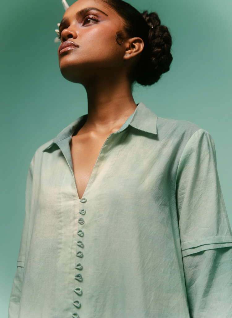 A midi shirt dress featuring front loop detailing with tucks in sleeve and inseam pockets. Length 47". The model is 5'7" and is wearing a size S.