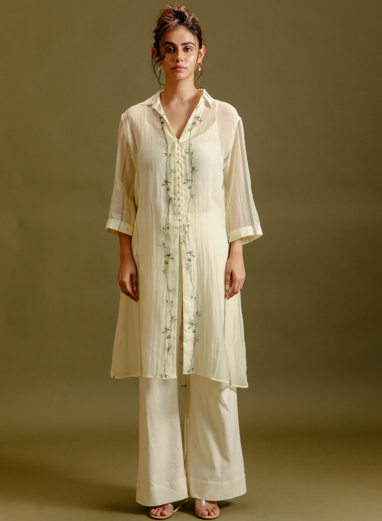 A floral printed sheer kurta featuring a collared V-neck and back tie up detailing. Length 40". The model is 5'7" and is wearing a size S.