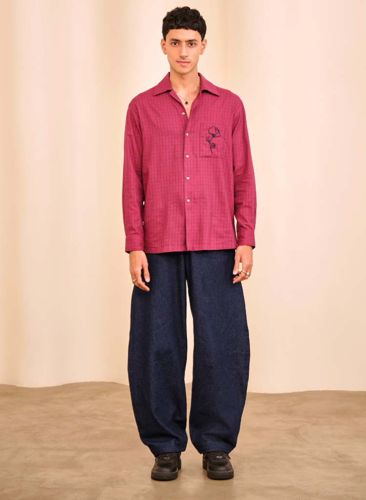 A relaxed fit shirt with an embroidered chest patch pocket featuring an open collar, front button closure and regular cuffs . Length 28.5" . The model is 6' and is wearing size S.