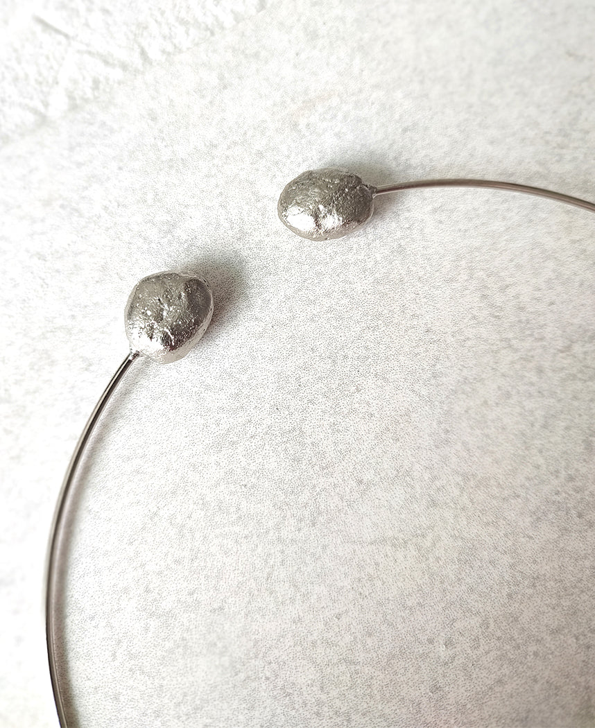 A structured statement open choker necklace with textured stone detail on either ends and a dainty long chain with textured stone pendant handcrafted in brass.