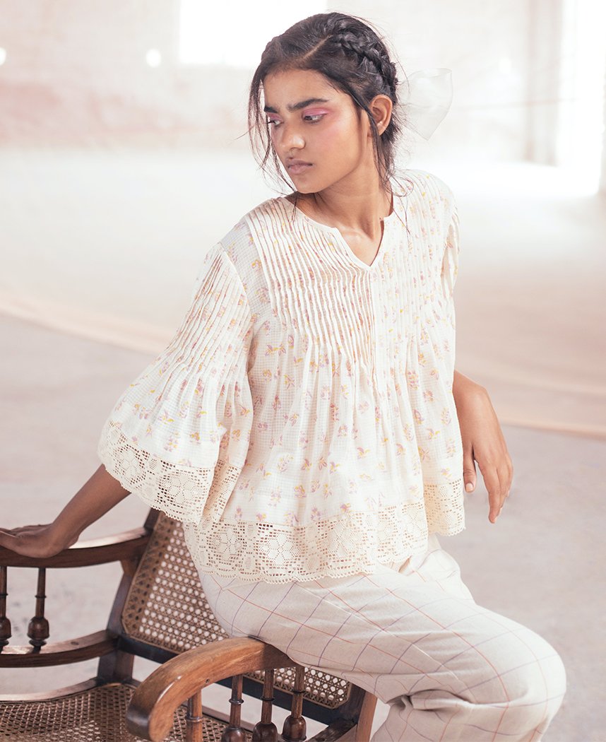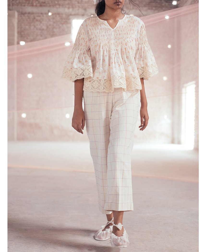 A two-piece set pairing the Lilac Blouse and Petunia Pants. The top features hand block printed flowers, lace trims and pin-tuck details around the yoke and sleeves. Length 22". The pants feature hand screen printed checks, a pleated waist detail, an elasticated back and inseam pockets. Length 37". The model is 5'8" and is wearing size S. Made in 100% cotton.