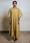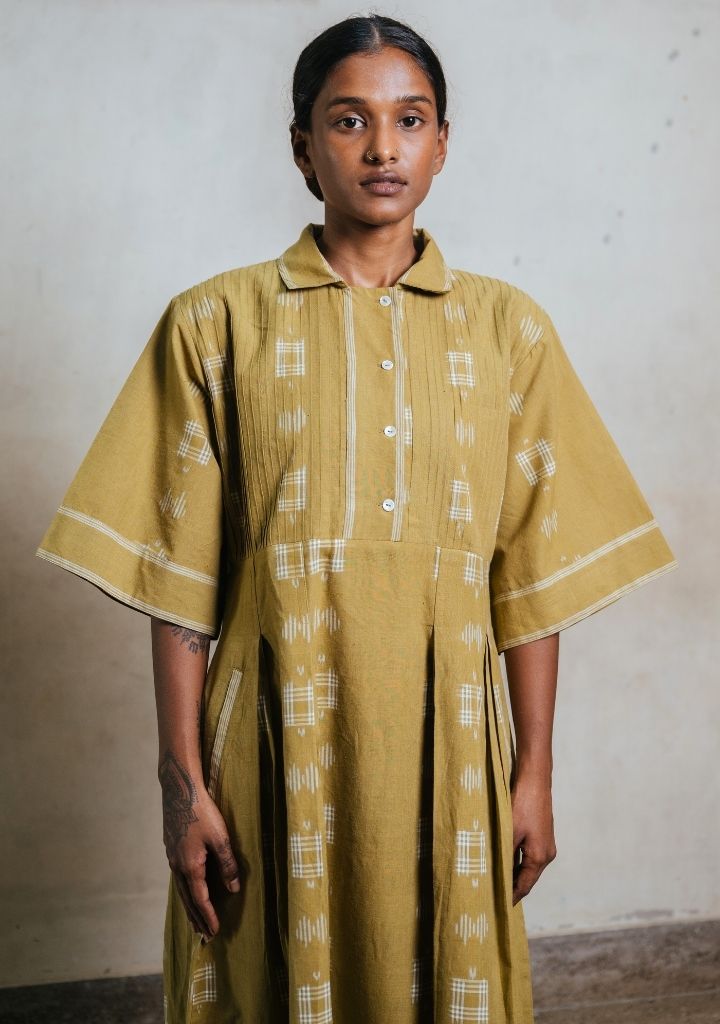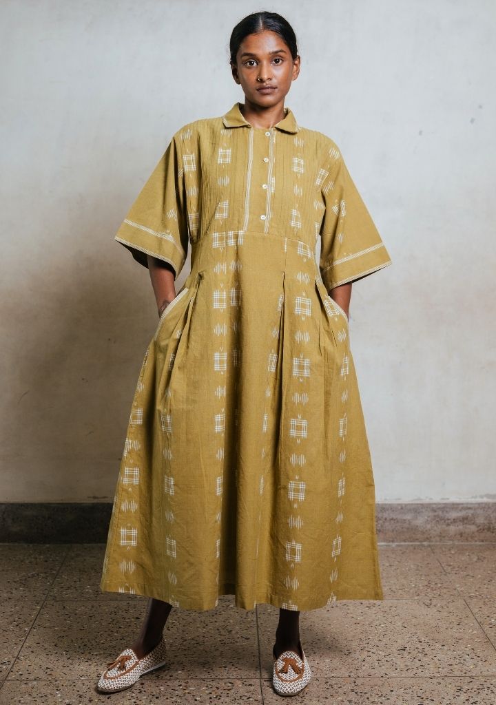 A printed midi shirt dress with a pleated skirt and pin tuck details in the front featuring a side welt pockets, a shirt collar, and a front button placket. Length 46.5". The model is 5'3" and is wearing a size S.