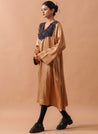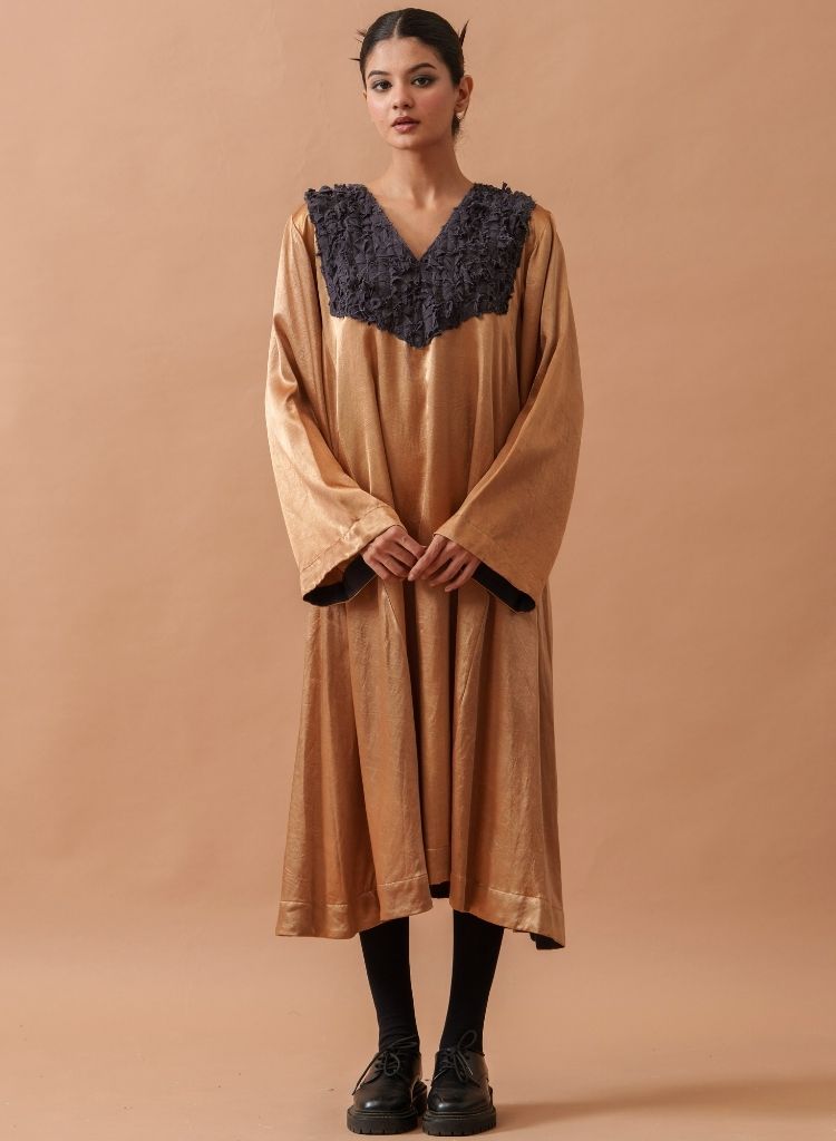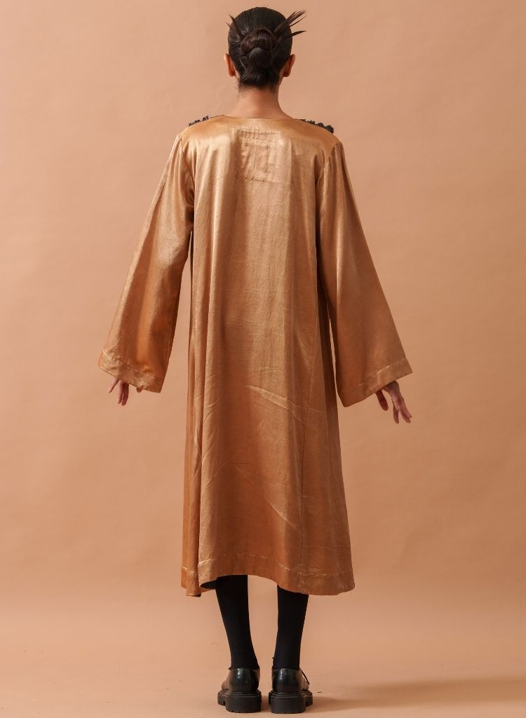 A relaxed-fitting tunic with hand-sewn appliqué texture on the front bodice and contrast facing featuring a V-neckline and long sleeves. Length 44". The model is 5'8" and is wearing size S.