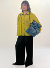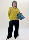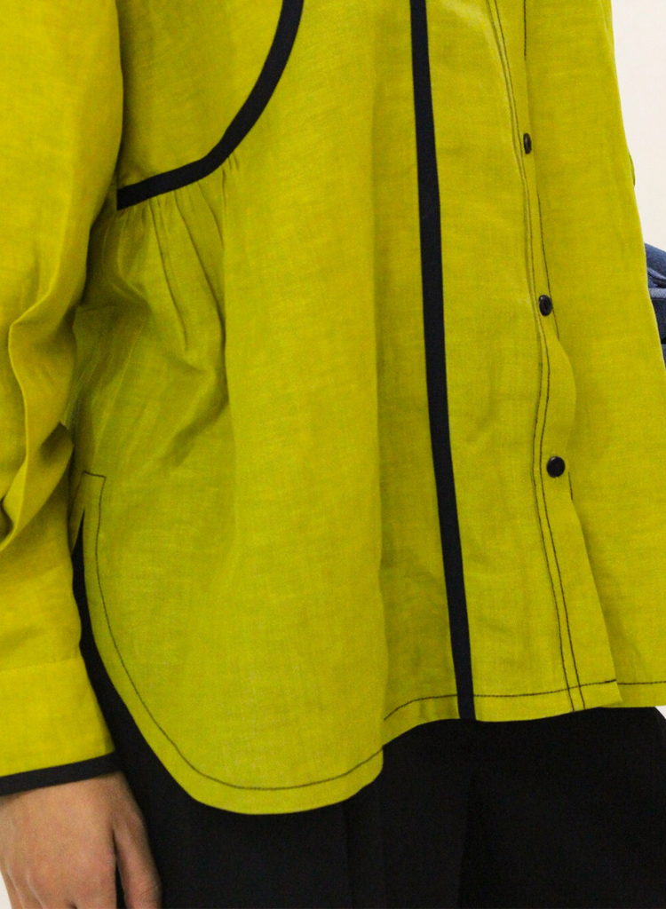 A button down shirt featuring side slits, a curved hemline and contrast tapes on the cuffs and collar. Length 26". The model is 5'8" and is wearing size S.