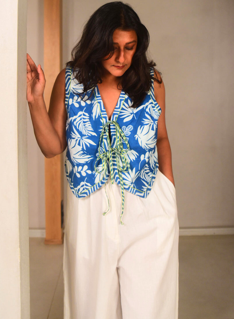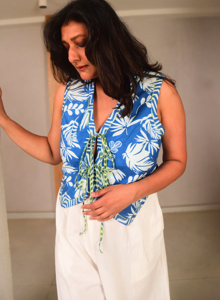 A sleeveless floral printed vest featuring tie-up detailing at the front, contrast print borders all over with lime green stitching details. Front length 21", Back length 17". The model is 5'6" and is wearing size L.