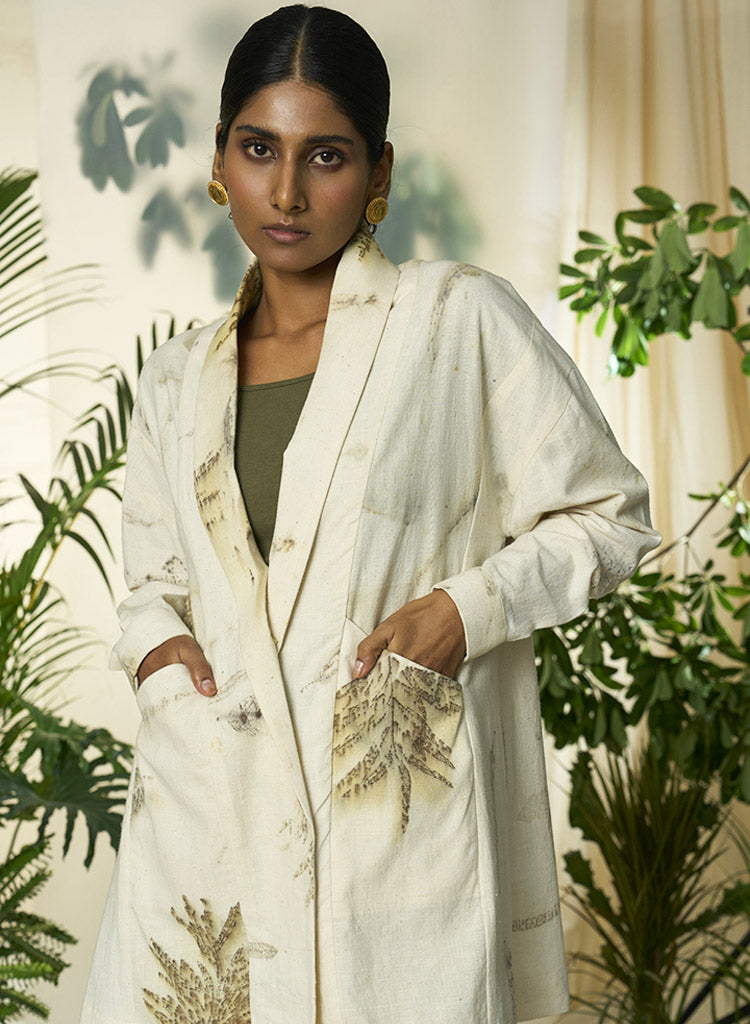 A relaxed fitting open front overlay featuring a shawl collar and slant pockets. Length 28". The model is 5'6" and is wearing a size S.