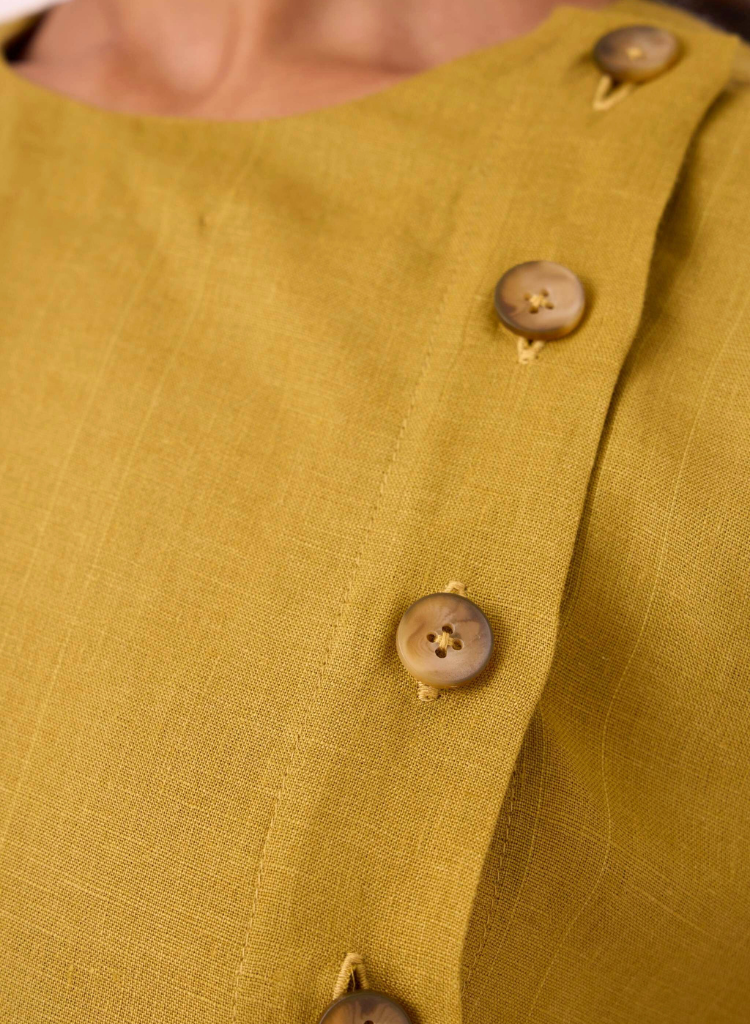 A drop shoulder dress with slit featuring modish round neck, in-seam pockets and an off-centre button down placket. The model is 5'6" and is wearing size XS.