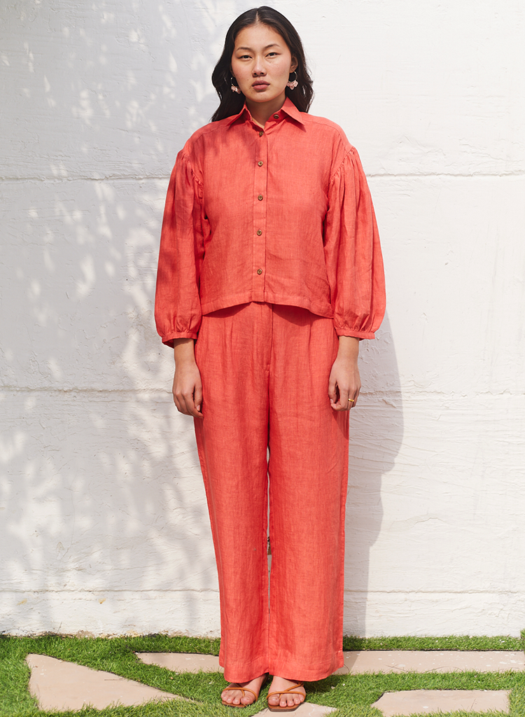 A two-piece set pairing the London Eye Linen Shirt and the Westminster Abbey Walk Trousers. The relaxed-fitting shirt with a center front button-down placket, drop shoulders, and long gathered, oversized sleeves features a classic collar and slightly gathers at the center back yoke. Length 22". The straight-fitting pants with panels and darts features a zipper fly fastening and side welt pockets. Length 41". The model is 5'11" and is wearing size M.