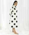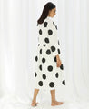 An A-line polka dot shirt dress with a gathered waist on one side. Made in cotton poplin. Features a mandarin collar, a concealed front placket and inseam pockets. Length 45".