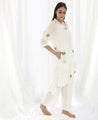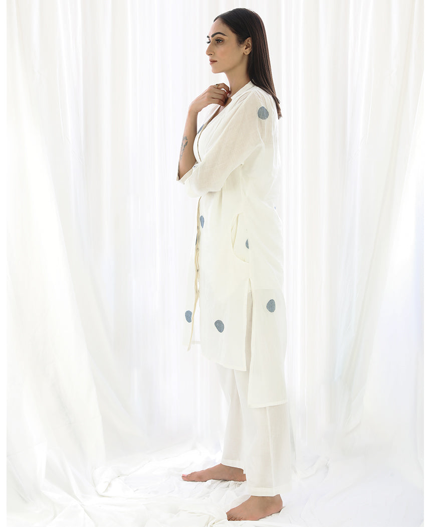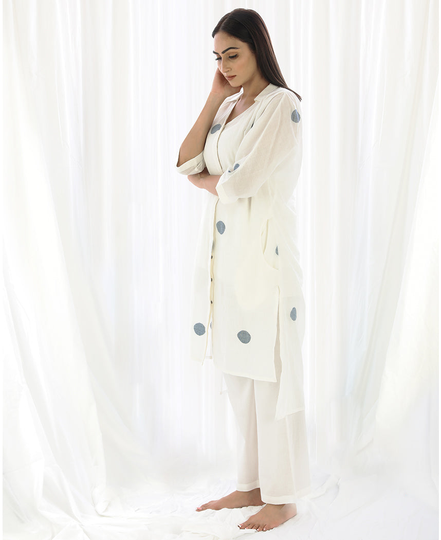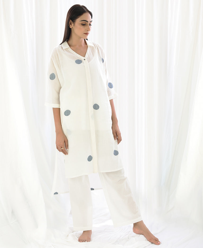 A relaxed polka dot tunic with a high low hem and side slits. Made in handwoven cotton. Features a collared V-neck and inseam pockets. Comes with a short slip. Front length 38", Back length 43".