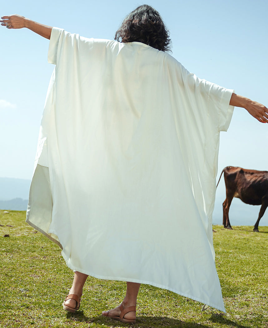 A full length open shrug with pintuck details featuring side slits, pockets and kimono sleeves. Length 56"-58" based on size. The model is 5'9" and is wearing size M.