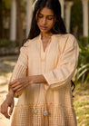 A flowy midi dress with checkered schiffli and delicate lace inserts featuring a band collar with a tie-up and a tiered hem. Length 40". The model is 5'7" and is wearing a size S.