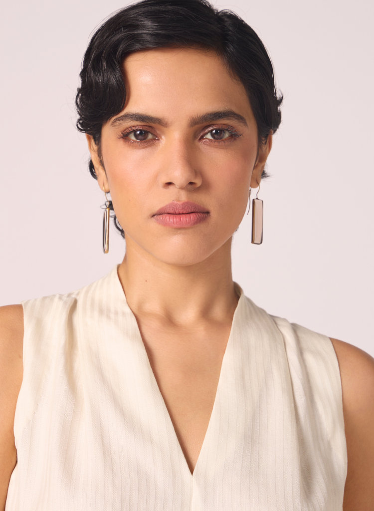 A sleeveless top featuring a V-neck with refined pleated collar and gentle gathers at back yoke. The model 5'8 and wearing a size S.