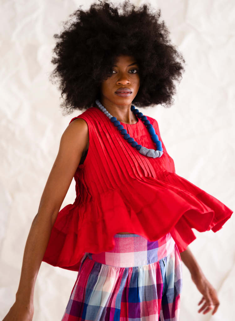 A sleeveless top featuring knife pleats that flow into a soft peplum flare. Length 22.5". The model is 5'5" and is wearing size S.