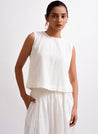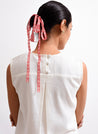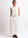 A two piece set pairing the Macy Top and the Alyssa Skirt. The pinstriped top with a pleat at the back features a round neck and a loop button at the back. Length 17". Made in cotton, lined. The A-line midi skirt with gather details features an elasticated waist and inseam pockets. Length 32". Made in silk Muslin, lined.