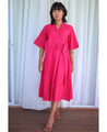A midi wrap dress featuring a notch collar and a side tie-up. Length 43". The model is 5'7" and is wearing a size M.