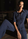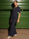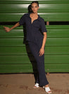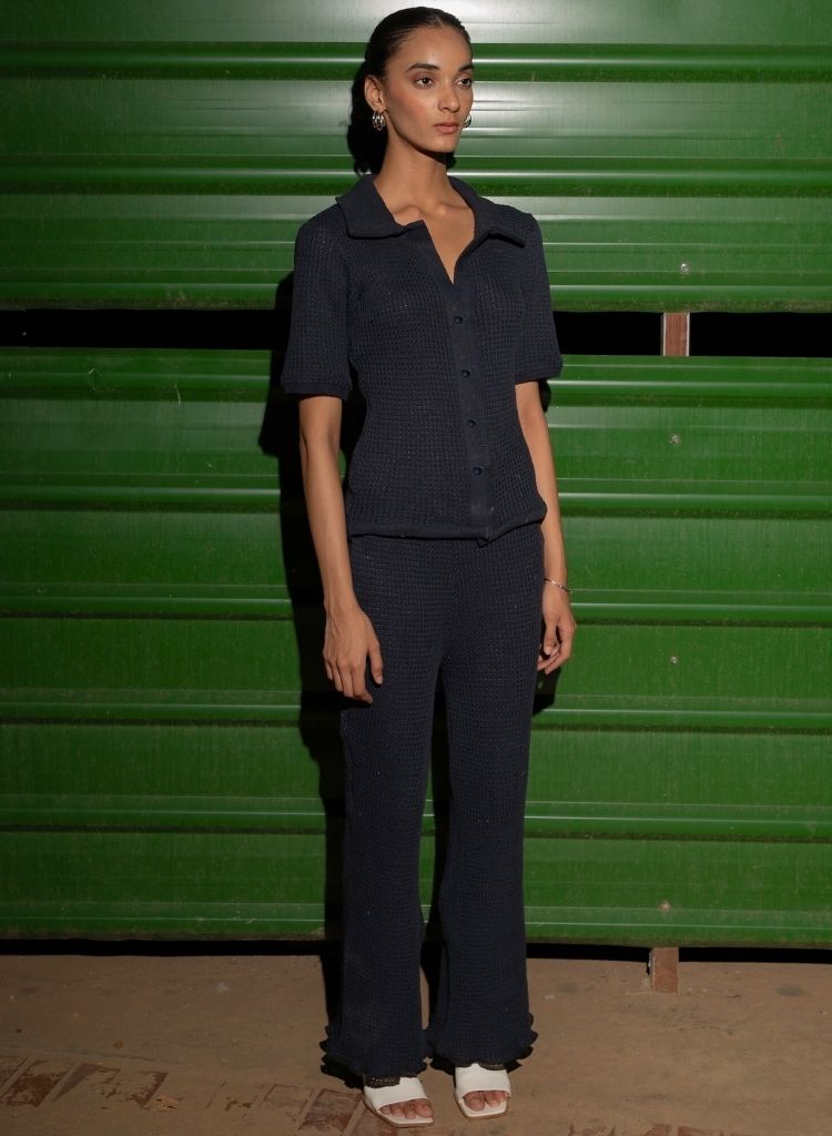 A shirt with a knitted 'double-tuck' texture and center front button-down placket with a classic collar and short sleeves. Length 28". The model is 5'9" and is wearing size S.