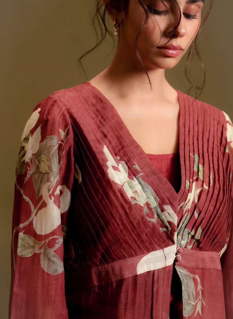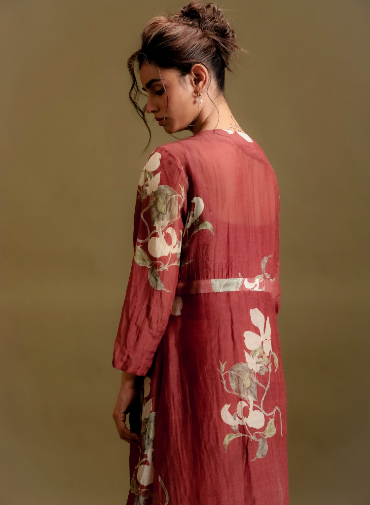 A two-piece set pairing the Magnolia Jacket and solid pants. The floral printed open jacket with pleat details features a V-neck and 3/4th sleeves. Length 42". Made in Chanderi. Comes with a slip. The slightly flared solid pants feature a fitted waist and inseam pockets. Length 40". Made in handwoven cotton.