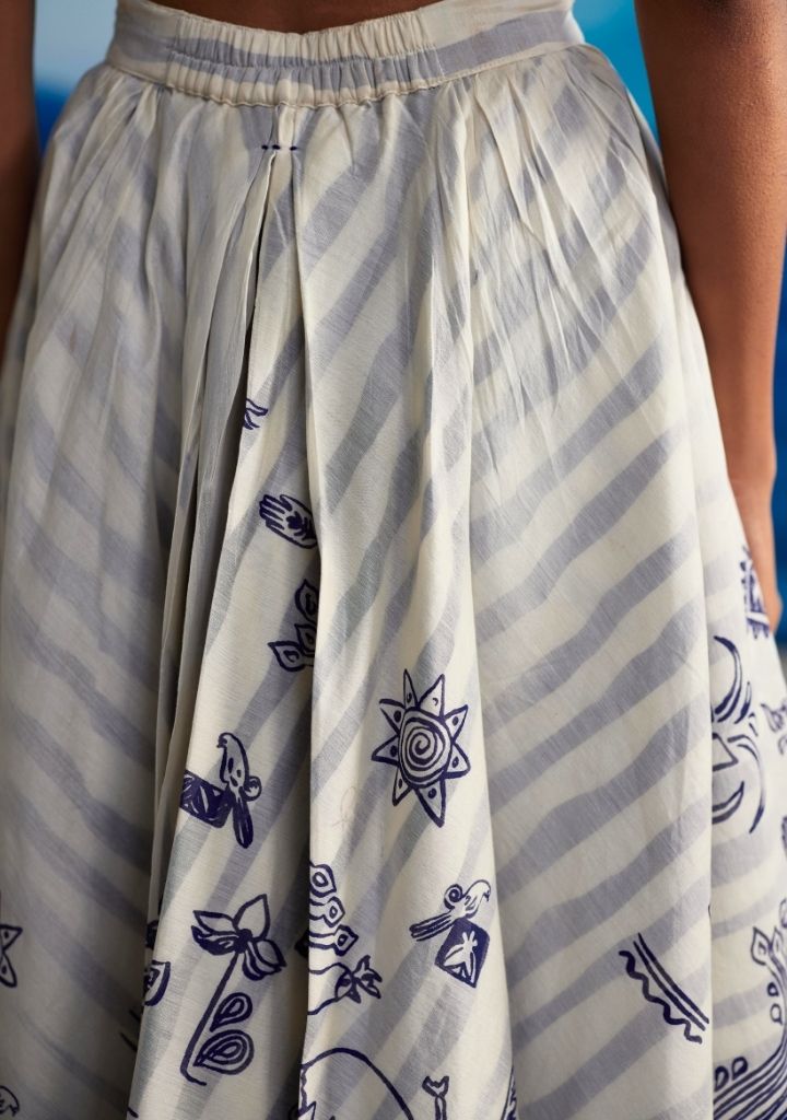A midi hand screen printed circular skirt with blue thred detail. Features elasticated waist back and side concealed zip opening. Length 32". The model is 5'8" and is wearing a size M.
