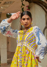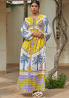 An A-line maxi dress with a mix of prints, lace detailing on panel attachments all-over and neck tie-up with shell embellishment featuring a round neck and long bishop sleeves. Length 54”. The model is 6ft and is wearing a size S.
