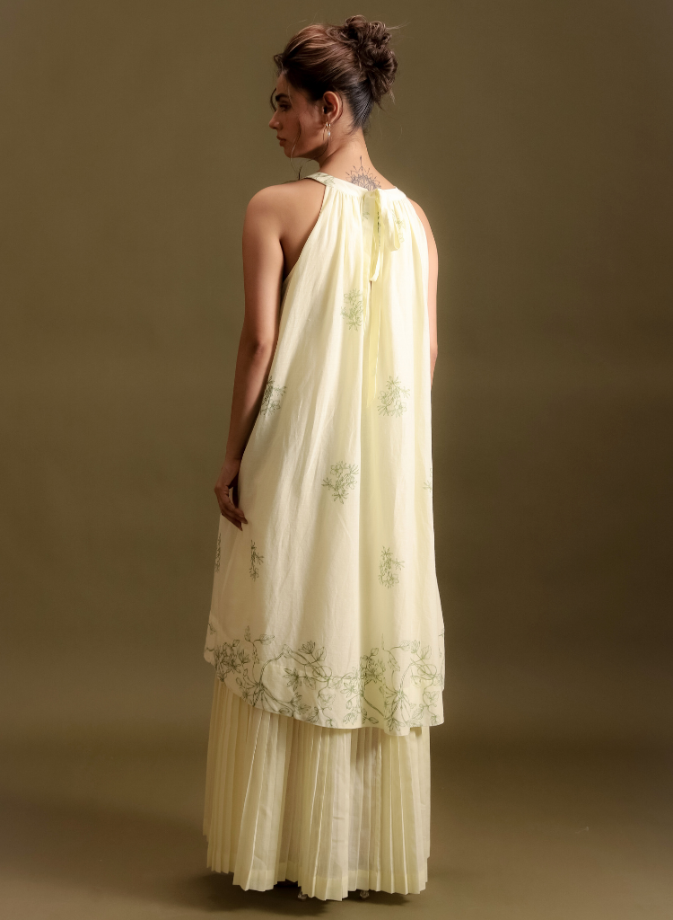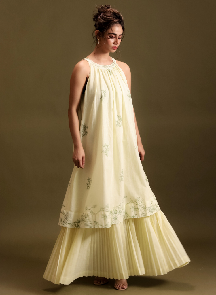 A halter neck dress with floral print featuring pleated layers and a tie up at the back. Length 59". The model is 5'7" and is wearing a size S.