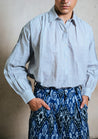 A checkered shirt featuring shoulder gathering and yoke details. Features a high-low hem and cuffed sleeves. Length 28". The model is 5'8" and is wearing a size S.