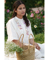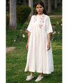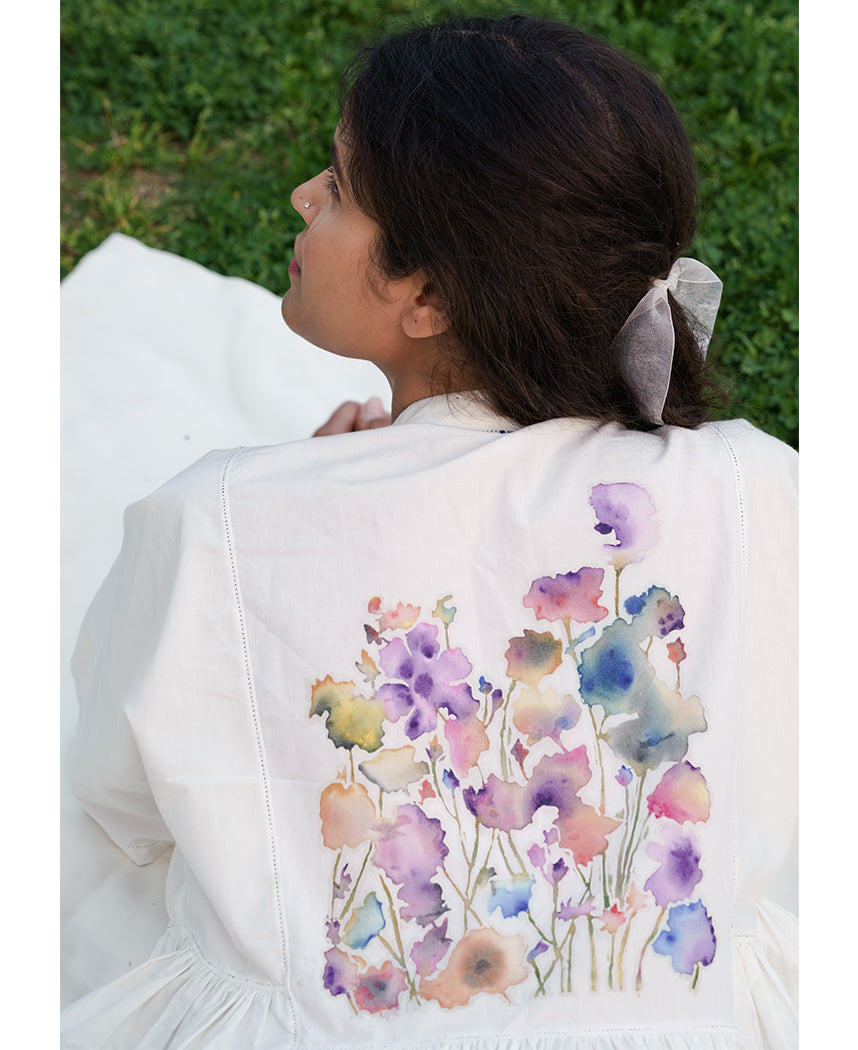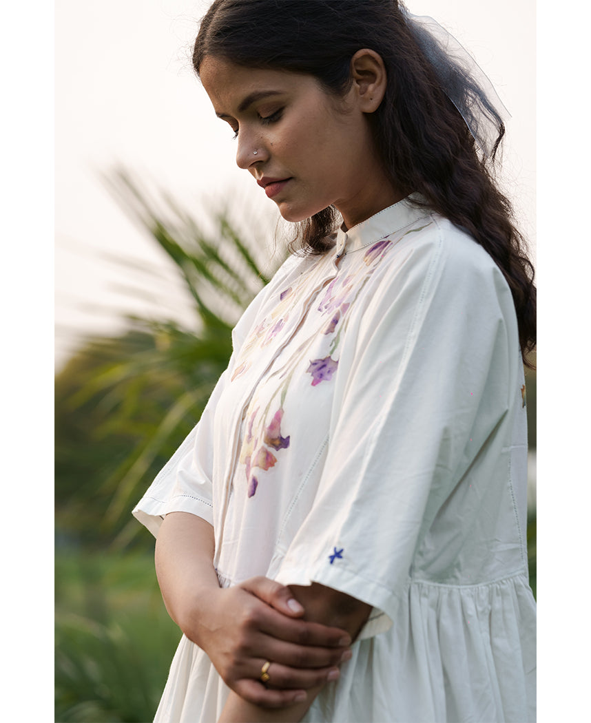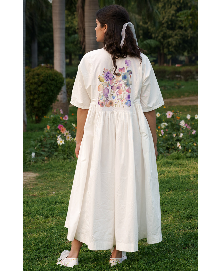A gathered A-line dress with hand painted flowers on the front and back yoke. Features a mandarin collar, contrast stitches, a concealed placket and inseam pockets. Length 47". The model is wearing a size M.