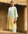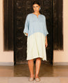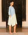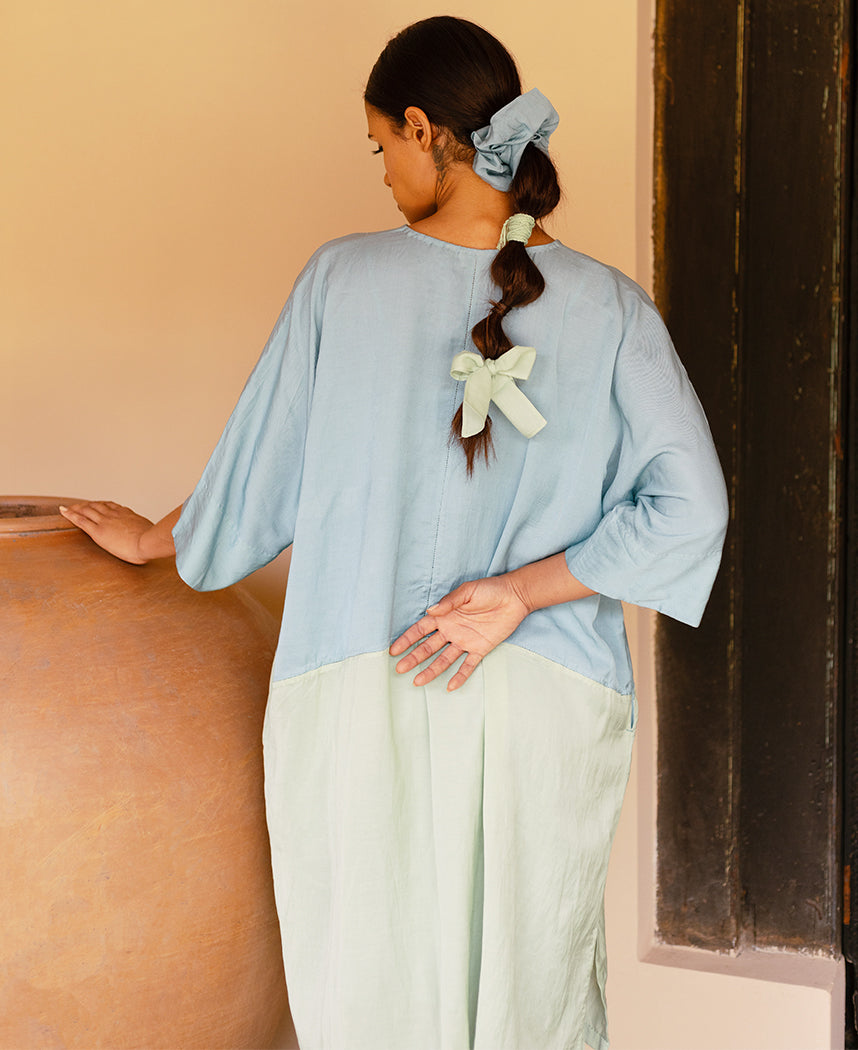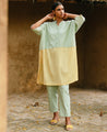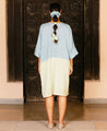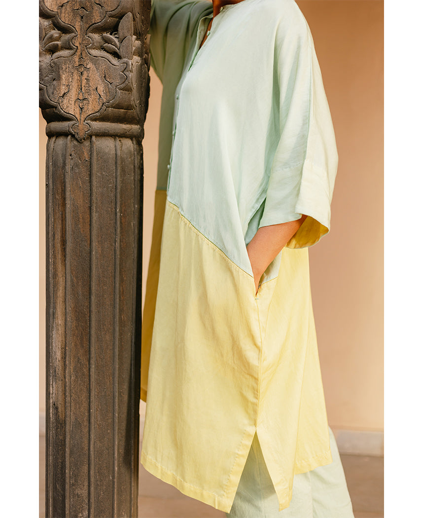 An oversized two-tone tunic with an asymmetric hem, front button placket and inseam pockets. Length 40". Comes in a free size and fits XS-XL.