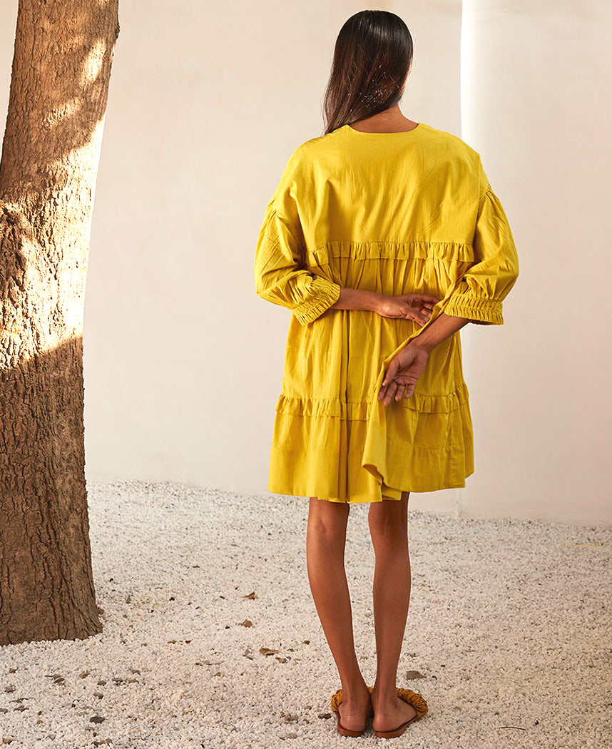 A short dress with tiered ruffle detailing featuring a V-neck, puff sleeves with pin tucks detailing and inseam pockets. Length 34.5". The model is 5'8" and is wearing size S.
