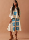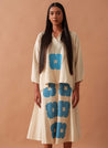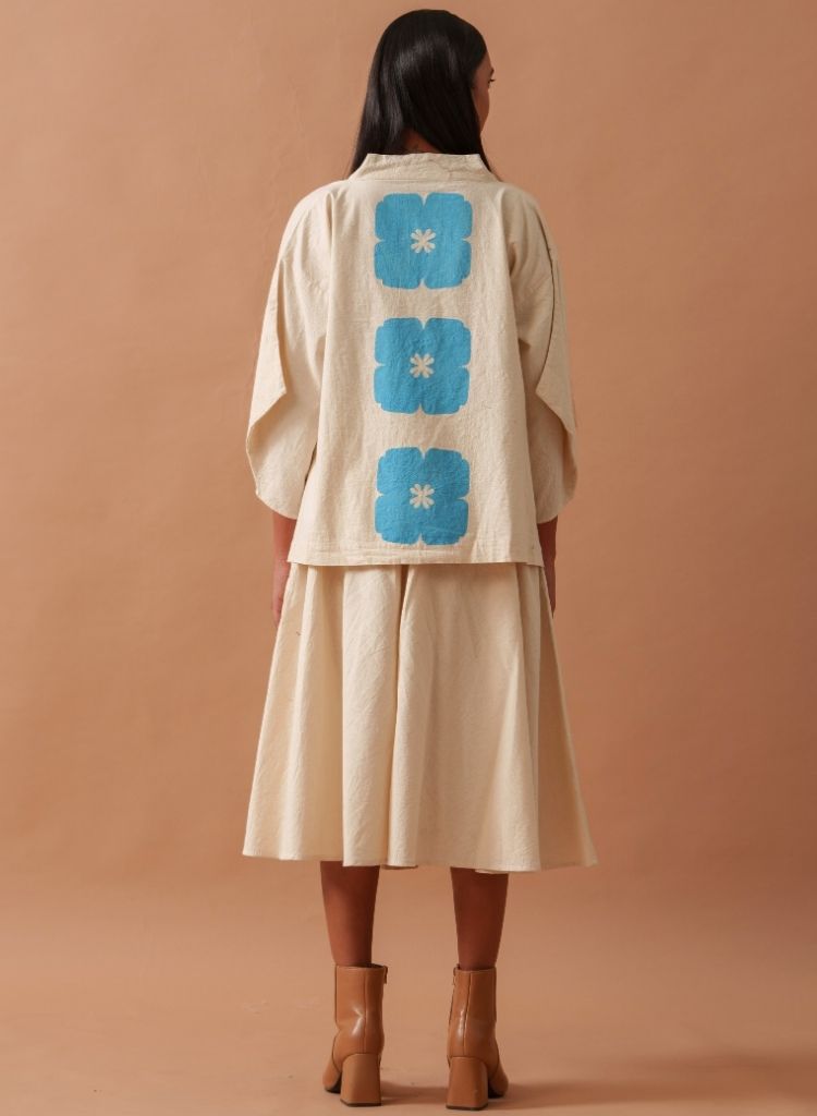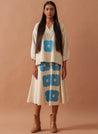 A two-piece set pairing the Marigold Top and the Marigold Skirt. The relaxed-fitting top with hand-block print and square-pattern 3/4 sleeves features an overlapping V-neckline. Length 24". The midi circular skirt with hand-block floral print feature an elasticated waistband. Length 37". The model is 5'8" and is wearing size S.